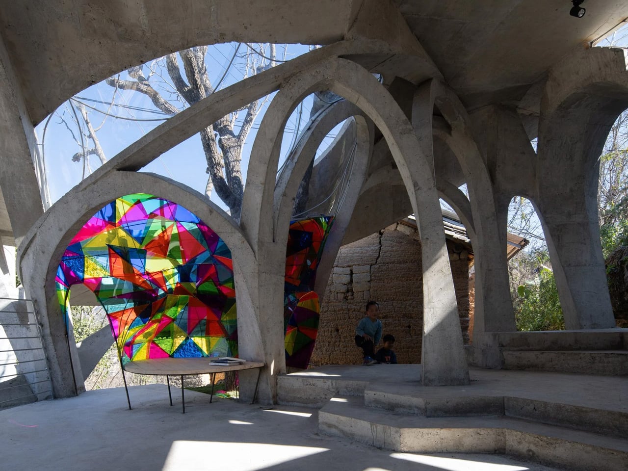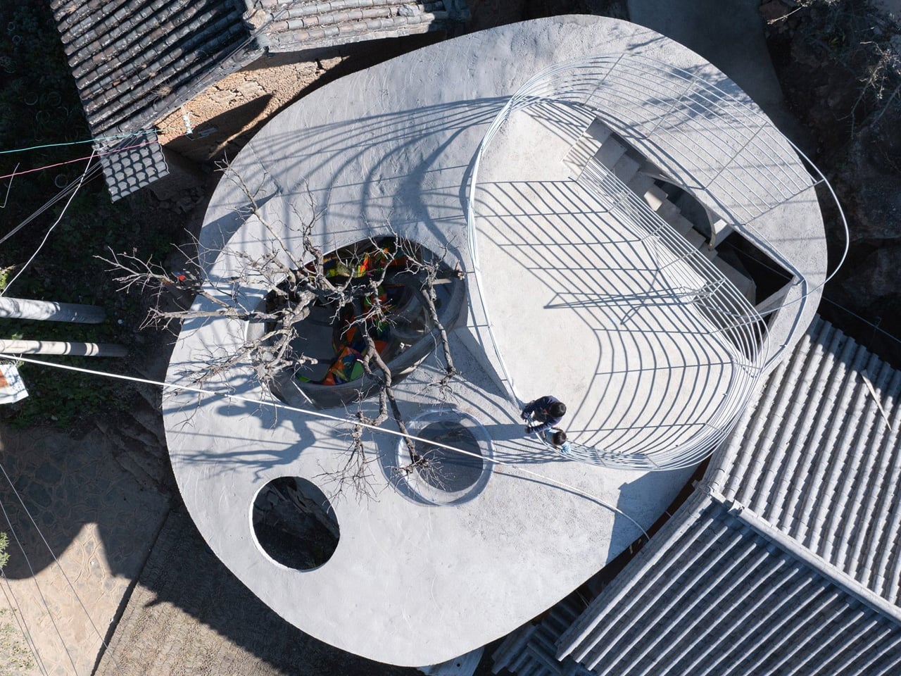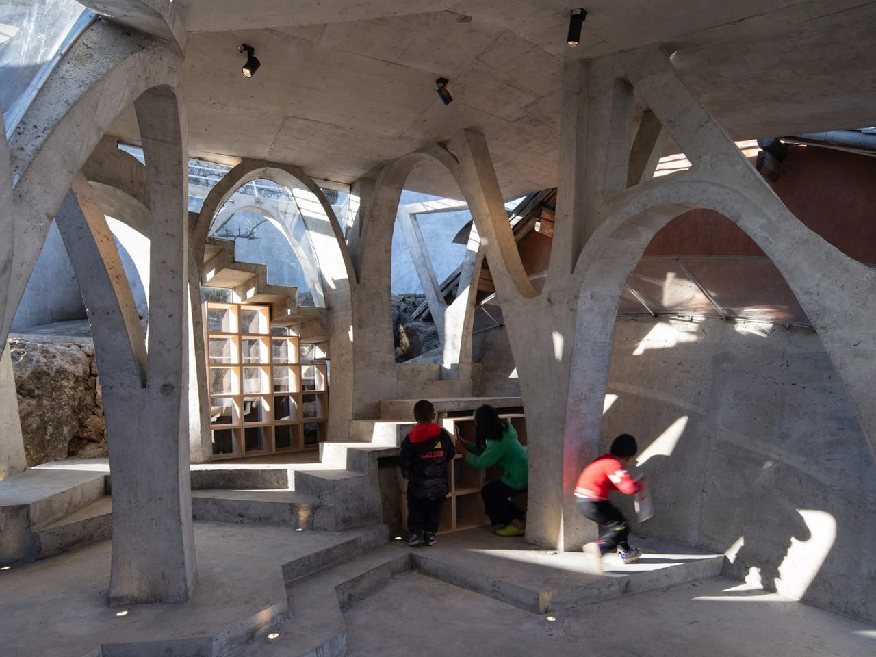 Built around an existing raisin tree, the library reflects close collaboration with local craftspeople. Ribbed steel bars are woven into tall arches, later encased in concrete to create an organic yet durable form. An irregular canopy, punctured with circular openings, filters daylight into the reading room, while one opening allows the tree to grow through the roof. Inside, curved concrete walls and timber shelves create cosy reading corners, as shifting light patterns animate the space and spark imagination.
