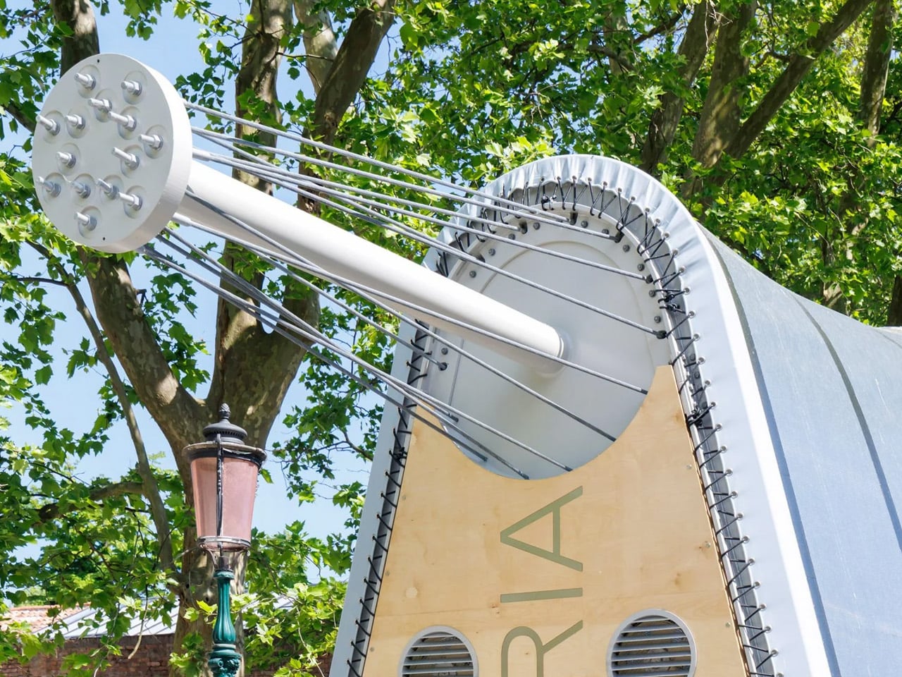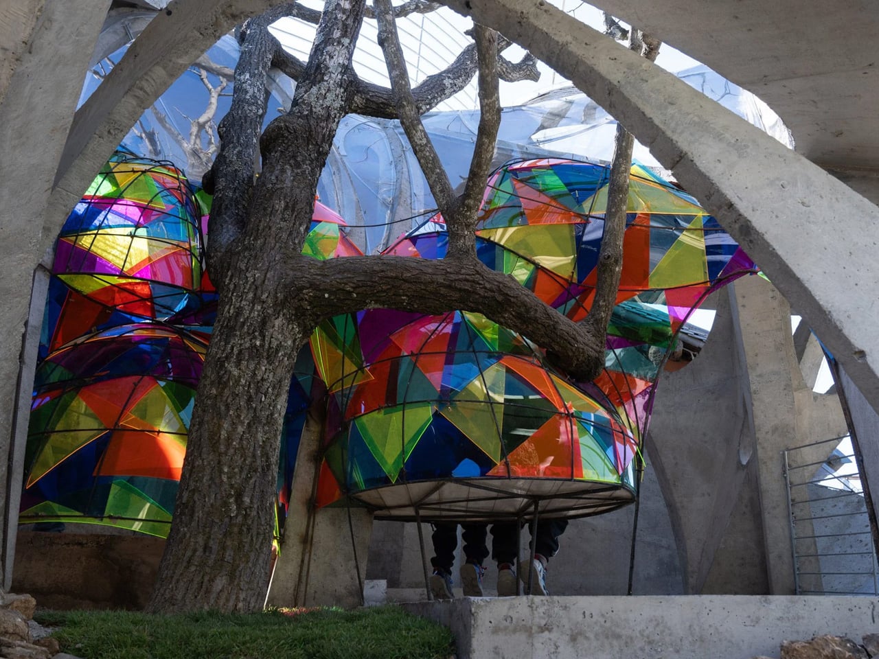 Wrapped in a transparent STFE architectural textile, the pavilion remains visually light while being durable and portable, allowing it to be packed into a container and relocated with ease. Currently situated in the Giardini della Biennale, it stands among experimental national pavilions, reinforcing the event’s spirit of innovation.
