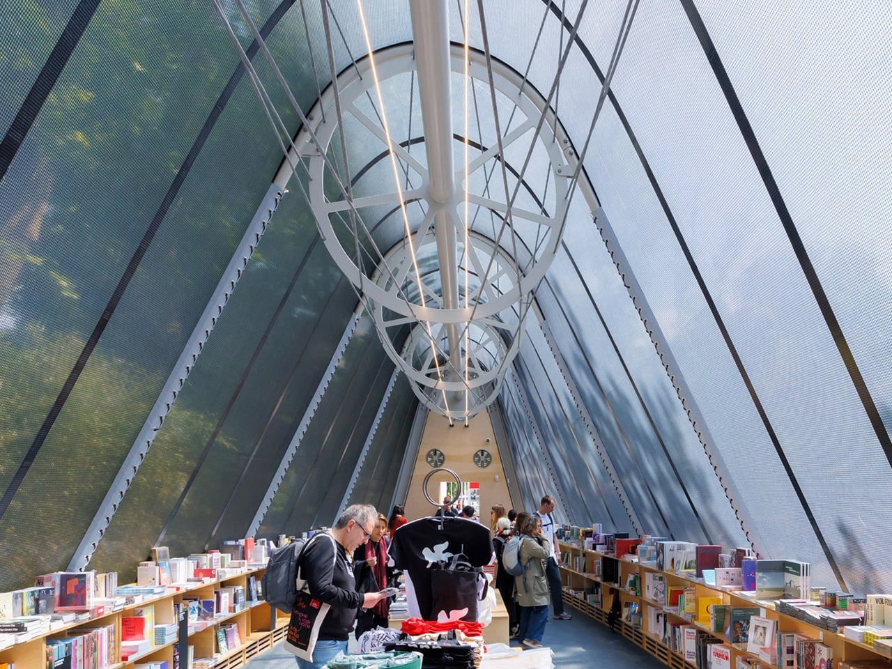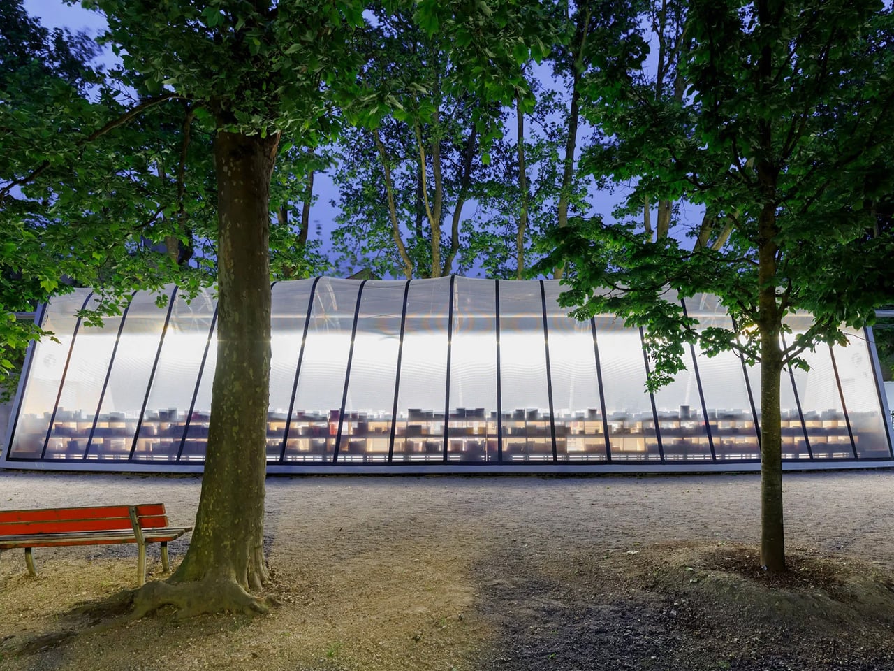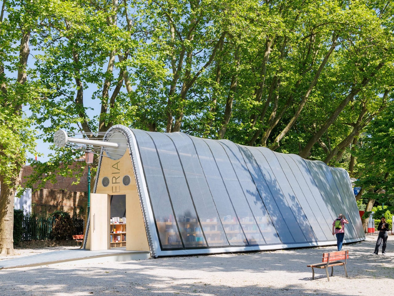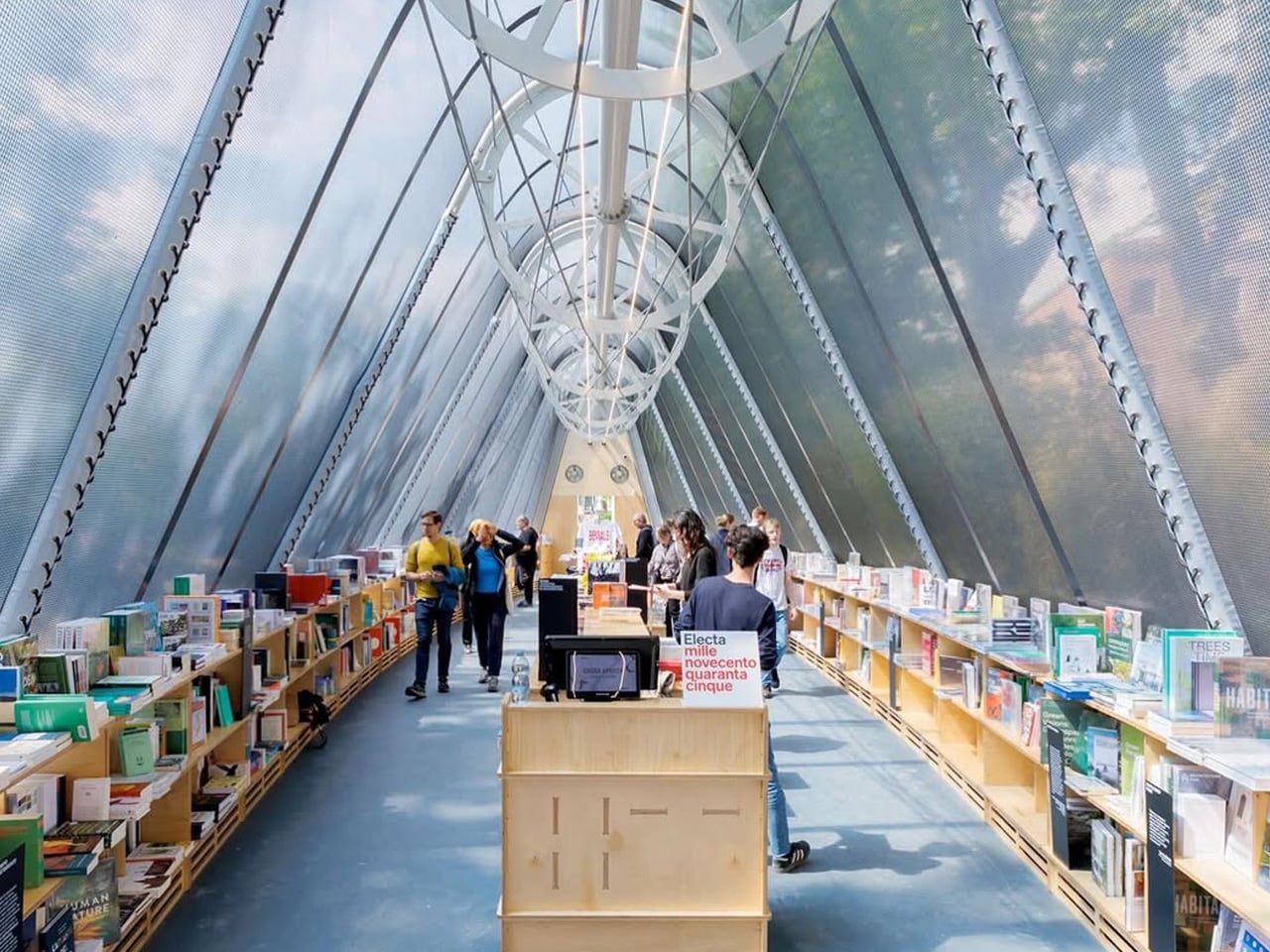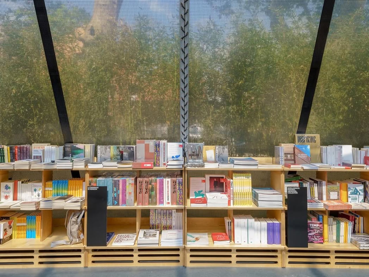 La Libreria is a lightweight, demountable library designed by Diller Scofidio + Renfro for the Venice Architecture Biennale, created to travel and encourage reading wherever it is installed. Spanning 24 metres, the pavilion draws on principles of tensile architecture influenced by the research of French engineer Robert Le Ricolais. Rather than being fixed to the ground, the structure gains stability from ballasts and the weight of the books themselves, which are displayed on timber shelves running along its length. This clever integration of structure and storage keeps the library open, flexible, and easy to reassemble in new settings.