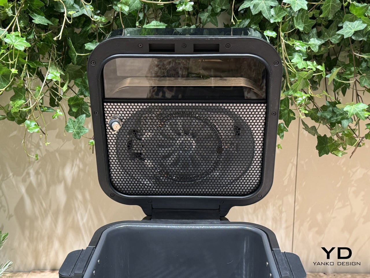 The fryer boasts a 7-liter internal capacity, accessed by a button on the front that ejects the fryer’s lid. Unlike most air fryers that open frontwards, Smeg’s opens from the top, letting you directly place items inside or even take the basket out by its handles. The coil and fan, which otherwise remains hidden from view, is directly visible here, right beside a tinted black visor that allows you to also look into the basket when the air fryer’s at work.
