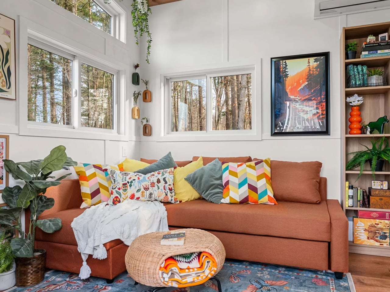 The floor plan is where things get genuinely clever. The main level handles the kitchen and living area, while the full-height gooseneck loft above serves as the primary bedroom — a queen-size bed, a desk, and a chair for working from home. From there, storage-integrated steps lead to a second, lower-ceilinged library loft, fitted with a long bookcase and a single sleeper sofa. It’s a rare thing in tiny living — a dedicated reading nook. The home also includes washer and dryer hookups, making it a fully functional permanent residence rather than a glorified weekend retreat.
