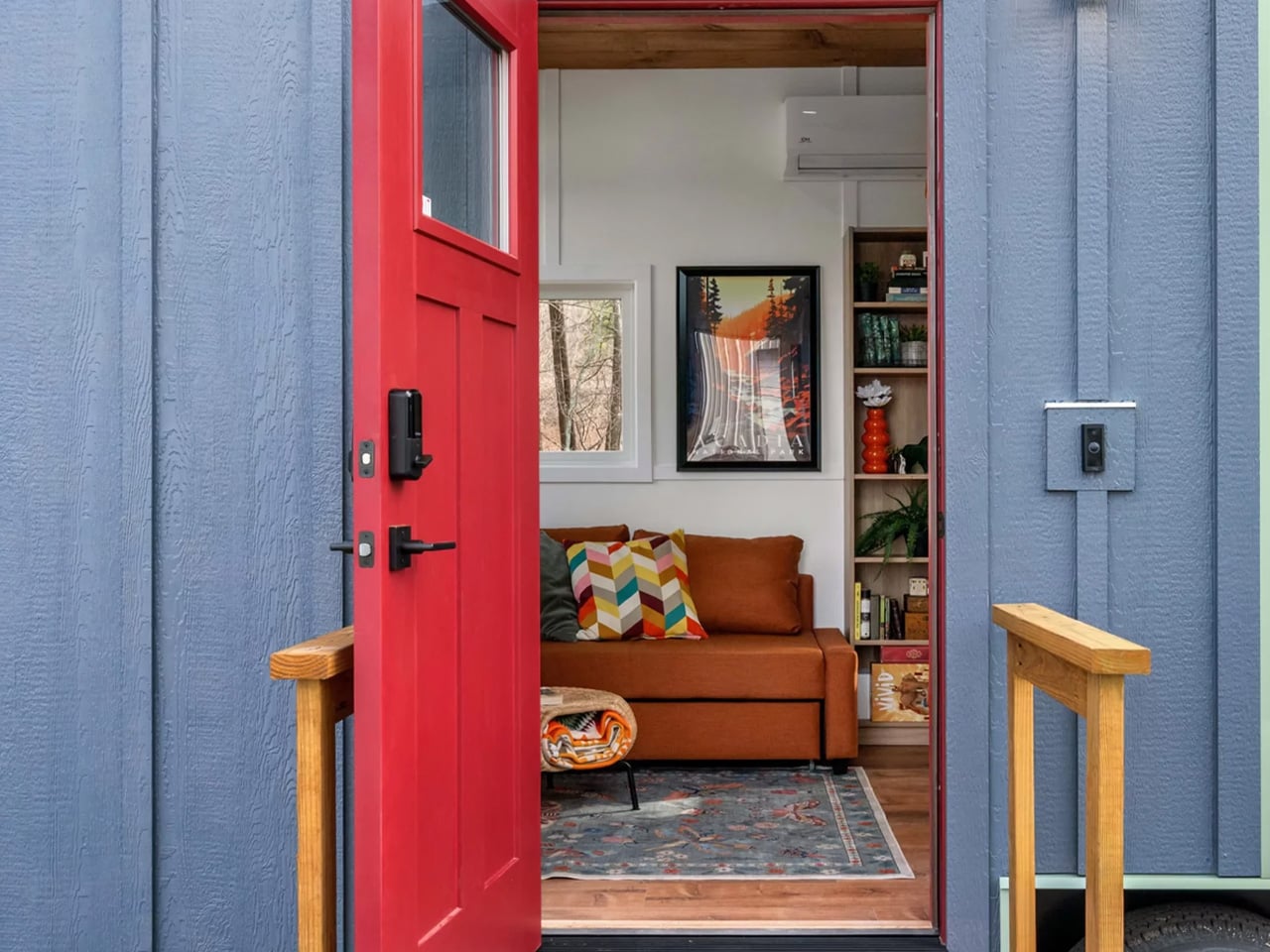 The exterior sets the tone early. A two-tone mix of metal and board and batten siding sits beneath a metal roof, giving the Knoll a sharp, modern look that reads more mountain cabin than mobile home. Inside, the design team leaned into color — boldly. The home’s interior philosophy is captured in a quote right on the Backcountry website: *”Color does not add a pleasant quality to design — it reinforces it.”* That commitment shows in every room, with rich, layered tones that make the space feel intentional rather than improvised.