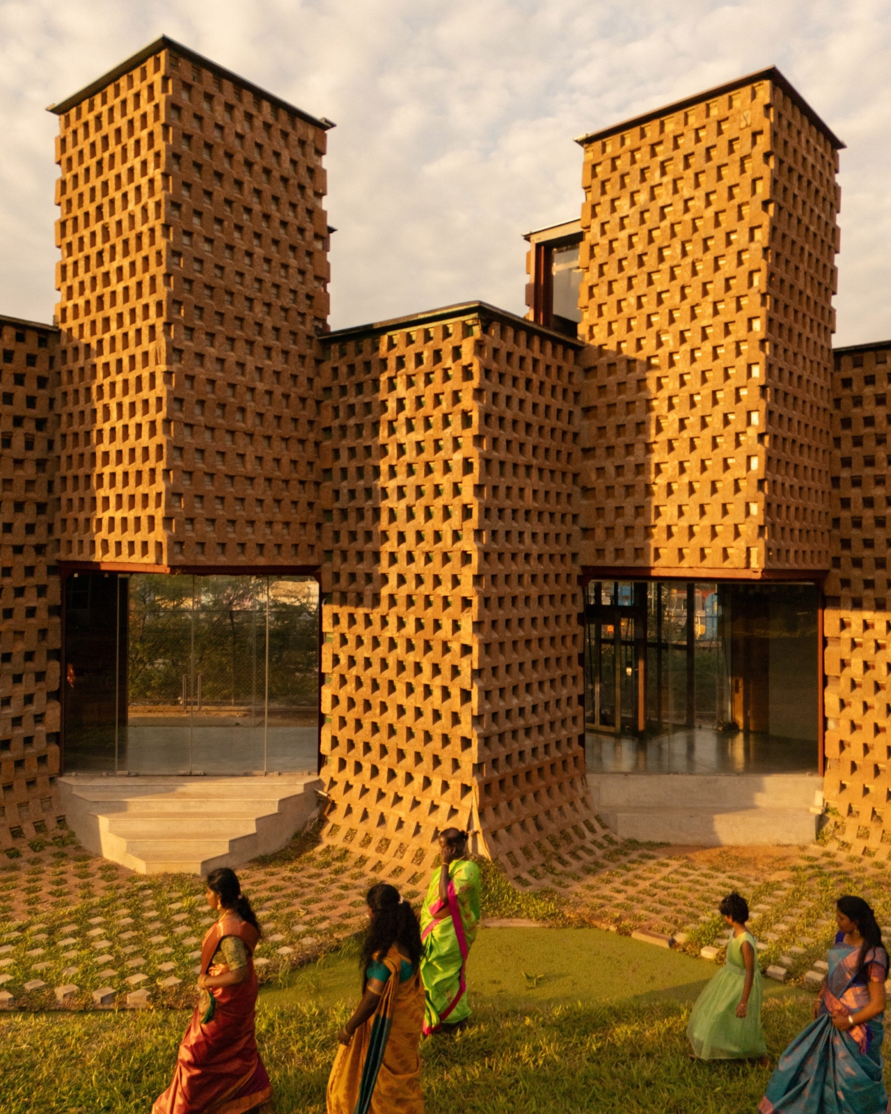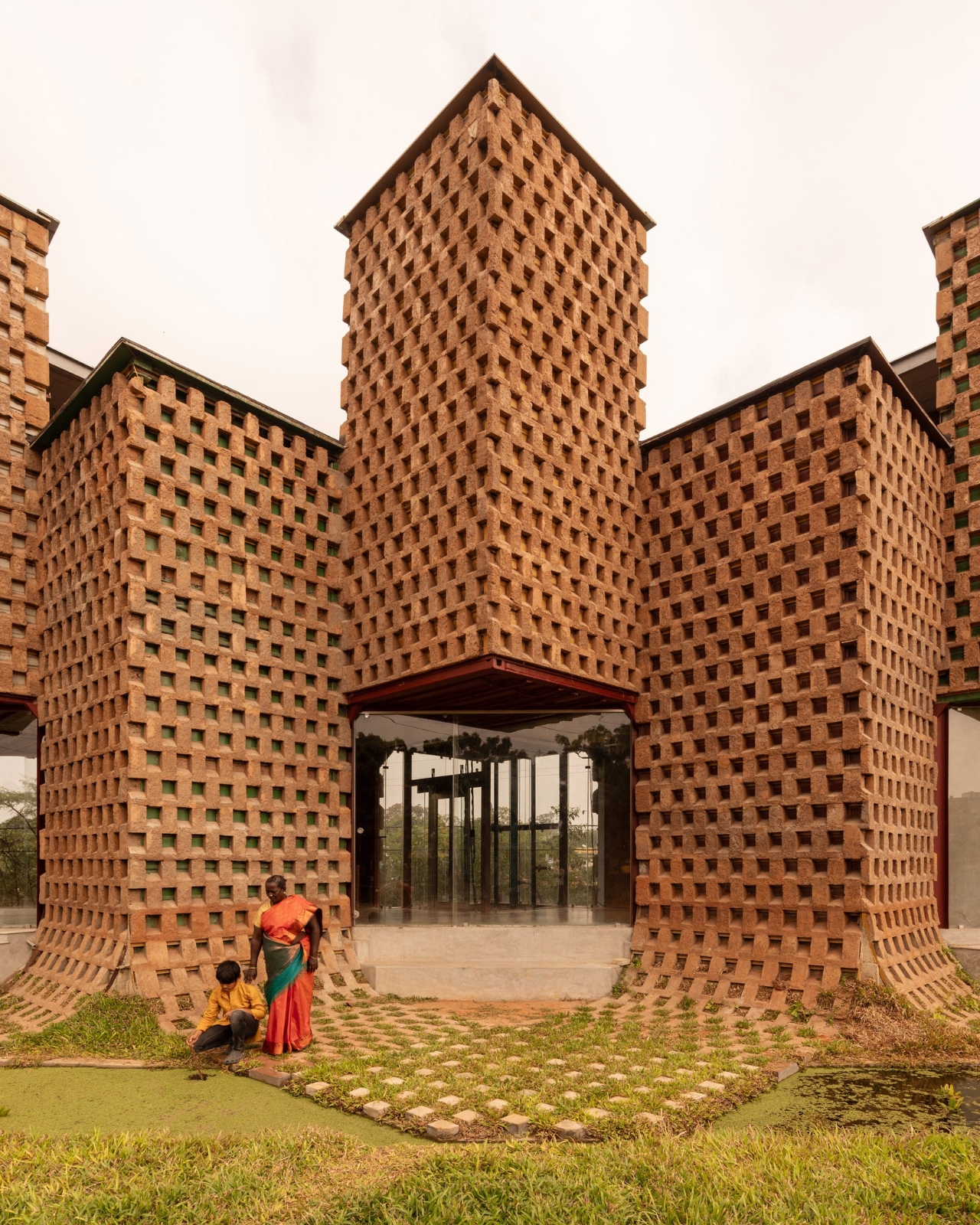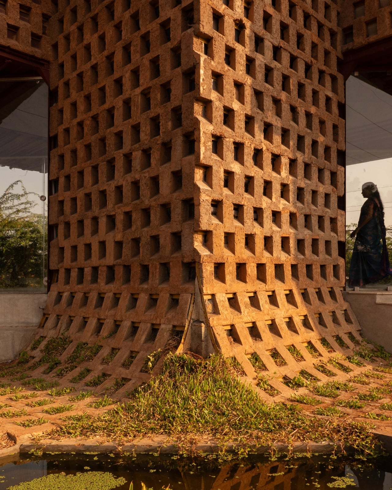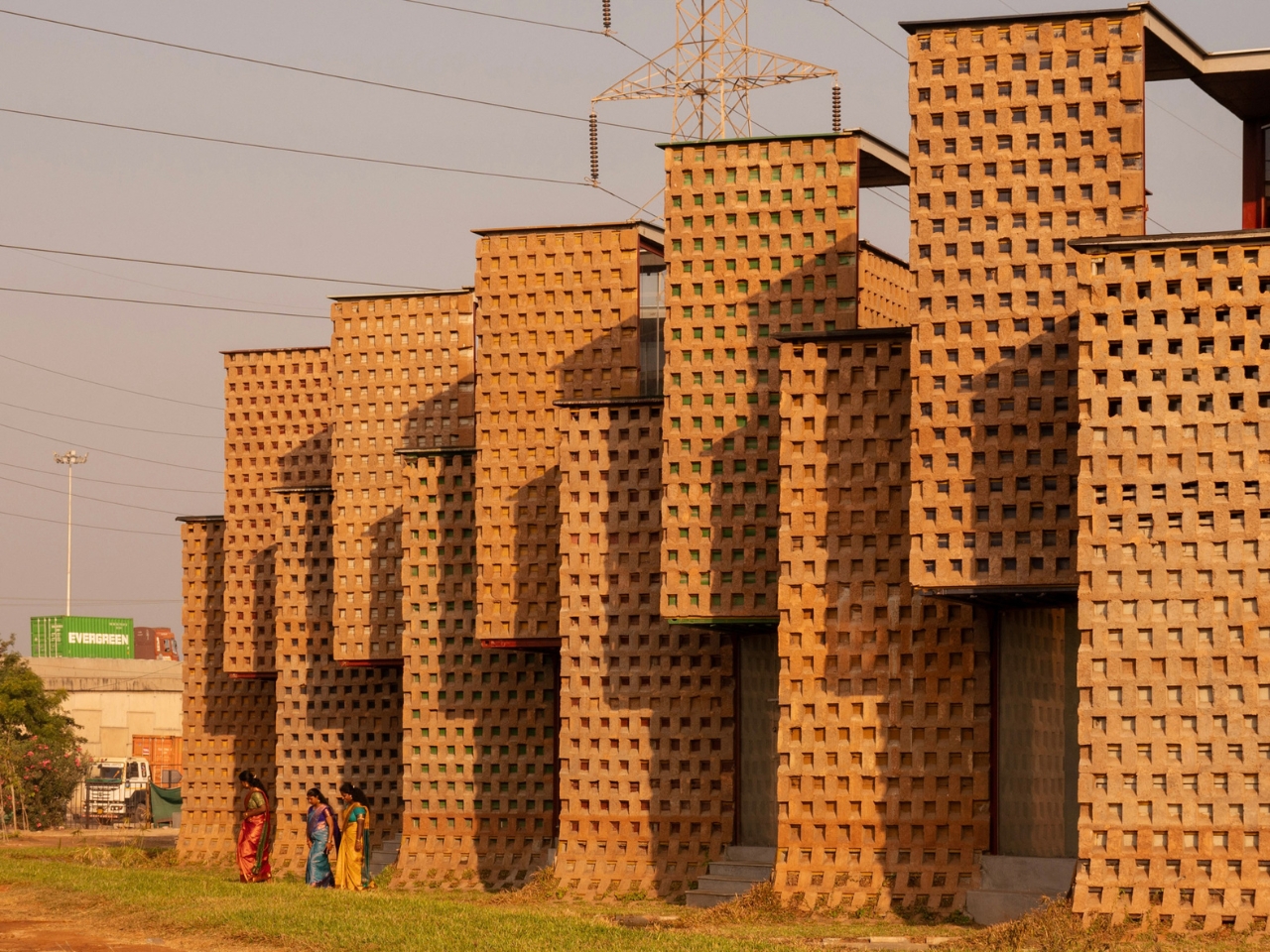 The team took twelve of those containers, cut them in half lengthways, and welded them onto a steel frame. That alone sounds like a fairly standard repurposing story. But here’s where it gets genuinely interesting. Instead of leaving the steel exposed or cladding it in something conventional, they coated the entire exterior in poured earth. Not just a surface treatment for looks, either. The earth layer was designed in an alternating recessed pattern specifically to reduce heat gain and cut the building’s reliance on air conditioning by 38 percent. In tropical Tamil Nadu, where heat is a year-round reality rather than a seasonal inconvenience, that’s a serious design decision with real consequences.
