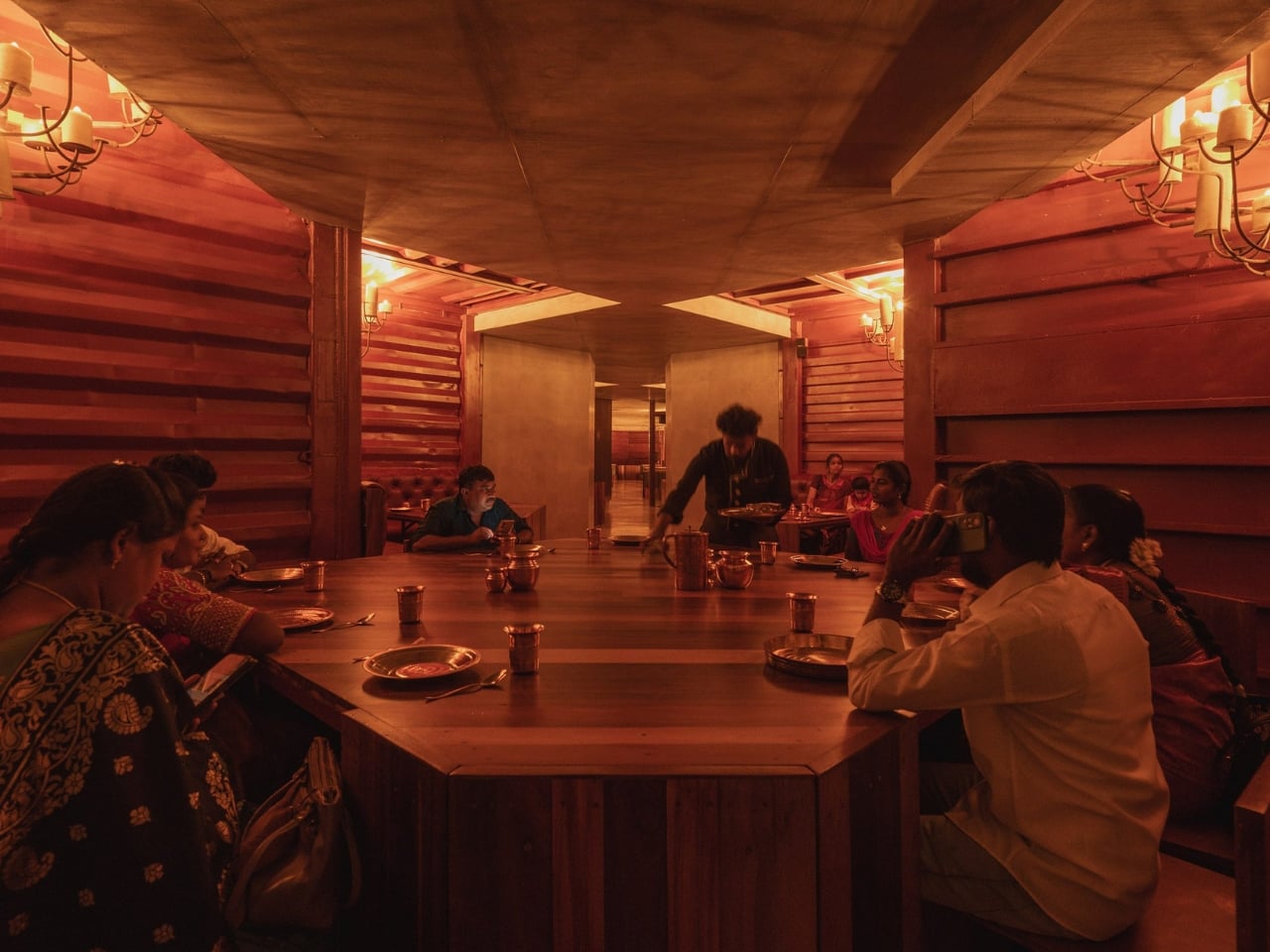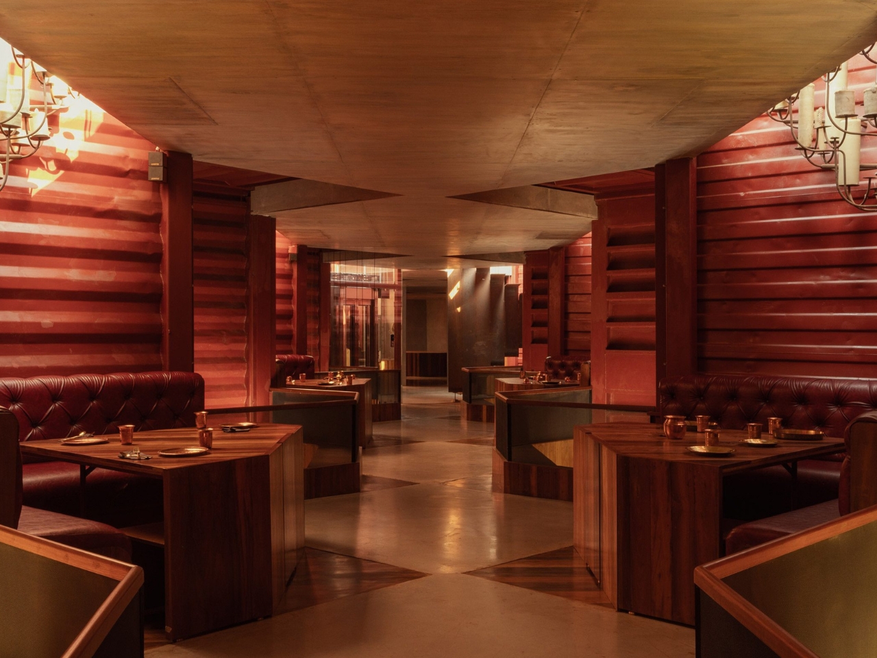 Inside, the layout follows the logic of the containers themselves. Each container half creates a defined niche, so the dining experience becomes surprisingly intimate for a space that seats 200 people. You’re tucked in, not floating in a vast open plan. During the day, natural light filters in through skylights above each seating area. At night, chandeliers made from old wax and pipes take over, filling the space with a glow that’s warm without being precious. The floors are laid with discarded deck wood and oxide. It’s a level of material consistency that tells you the team thought carefully about every surface, not just the ones visible from the street.