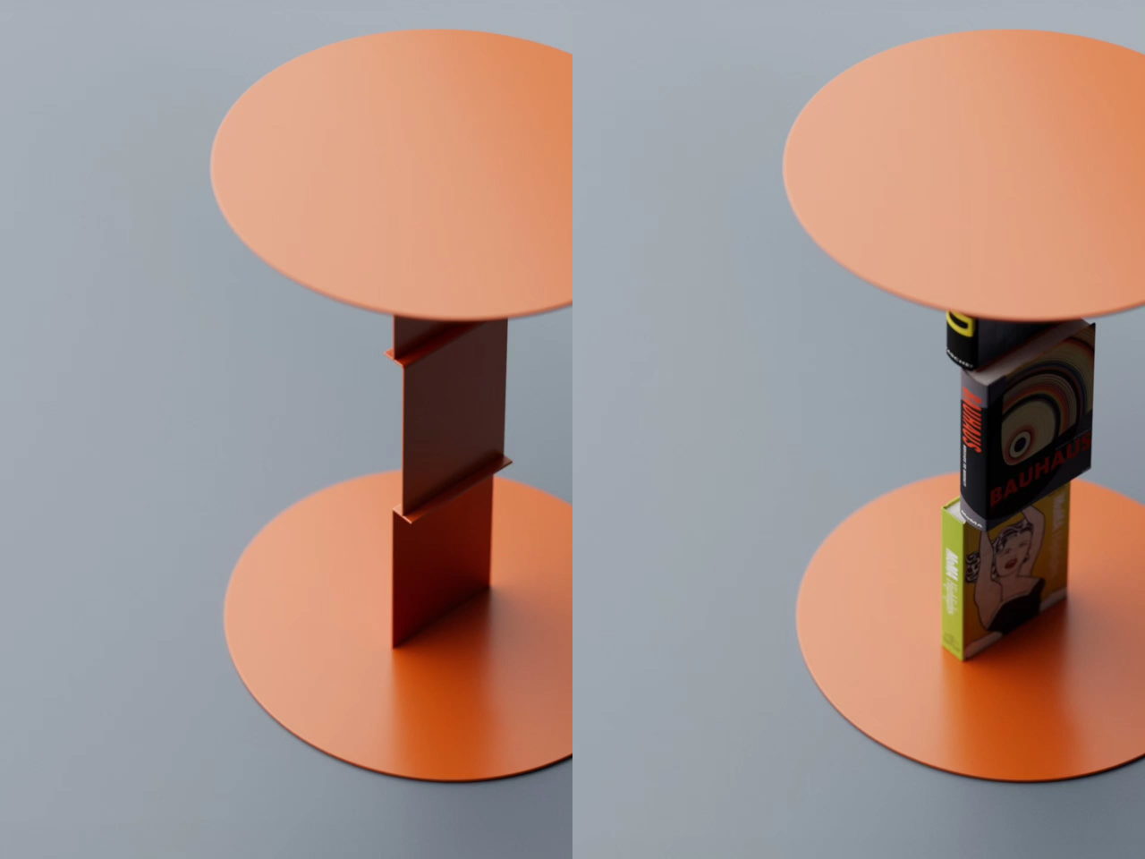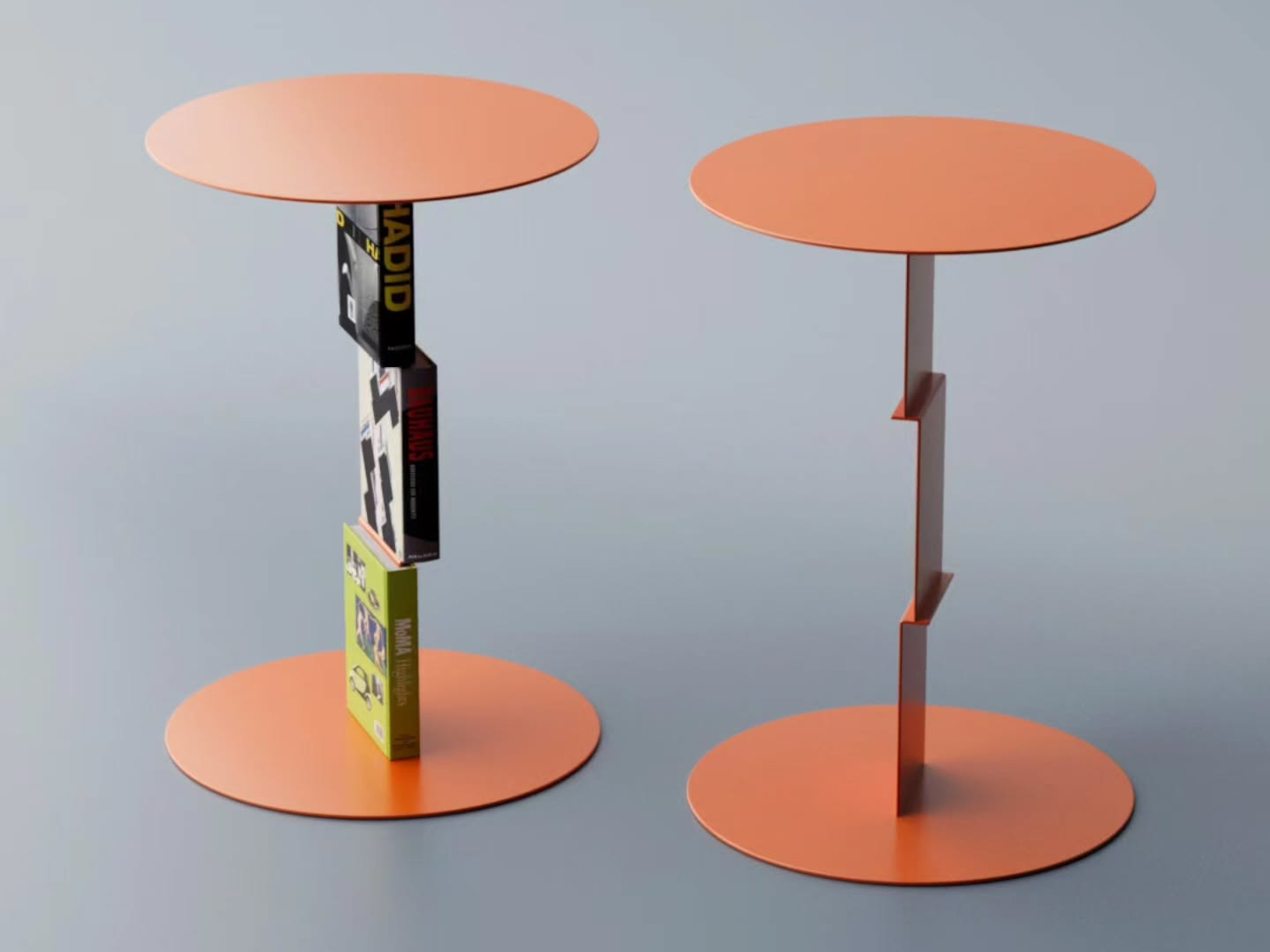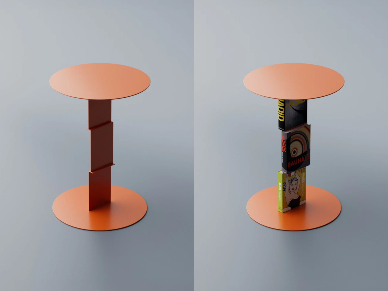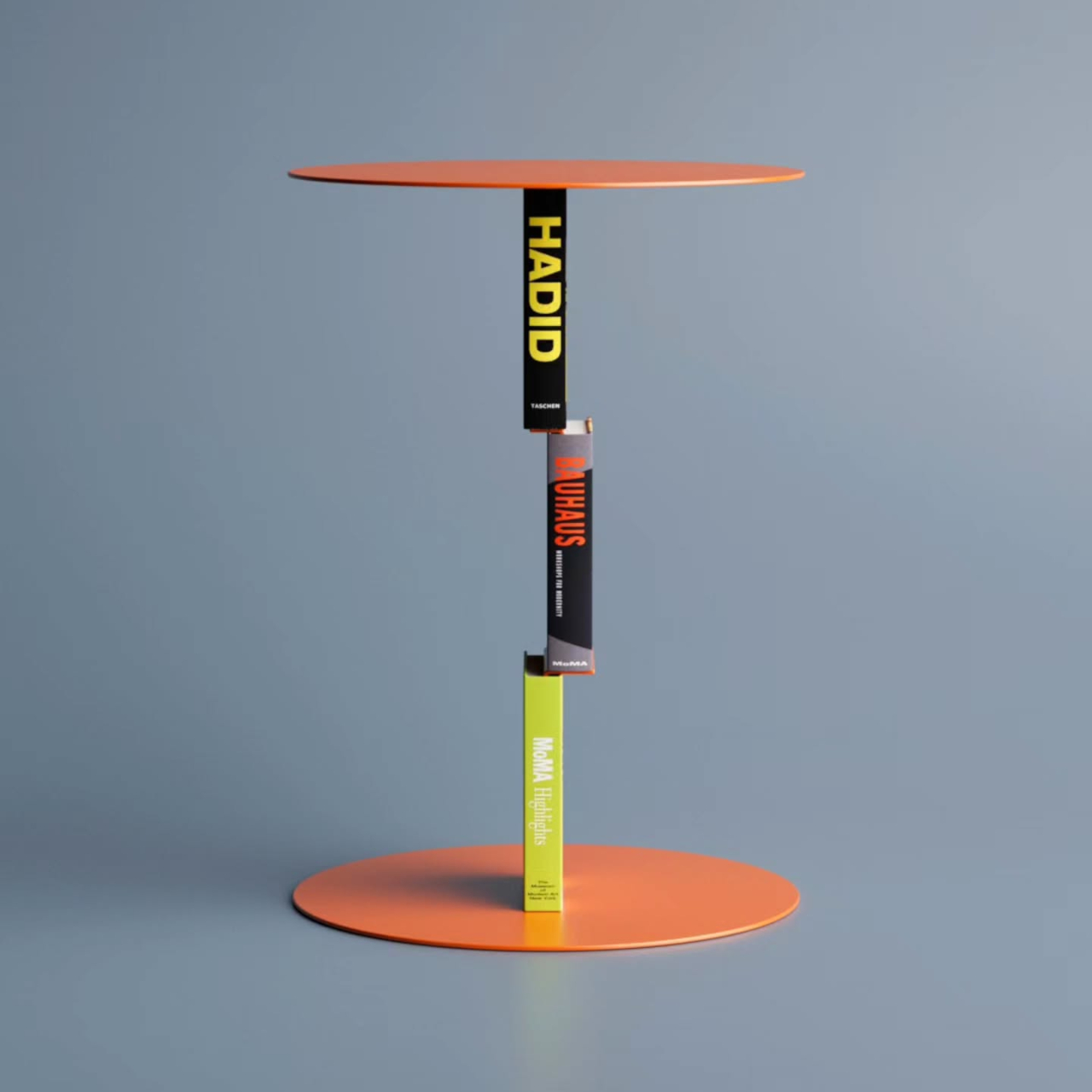 The trick borrows from a principle already used in certain bookmarks and floating wall shelves, where a thin metal channel slides between a book’s pages and disappears behind the covers. Aktay applies the same logic vertically: the table’s central stem has integrated clips that hold books upright against the structure. Slot a few thick art or design volumes in, and the metal seems to dissolve quietly into the spines.