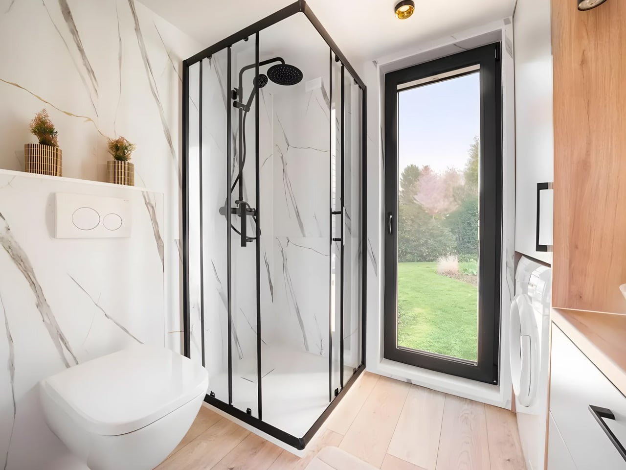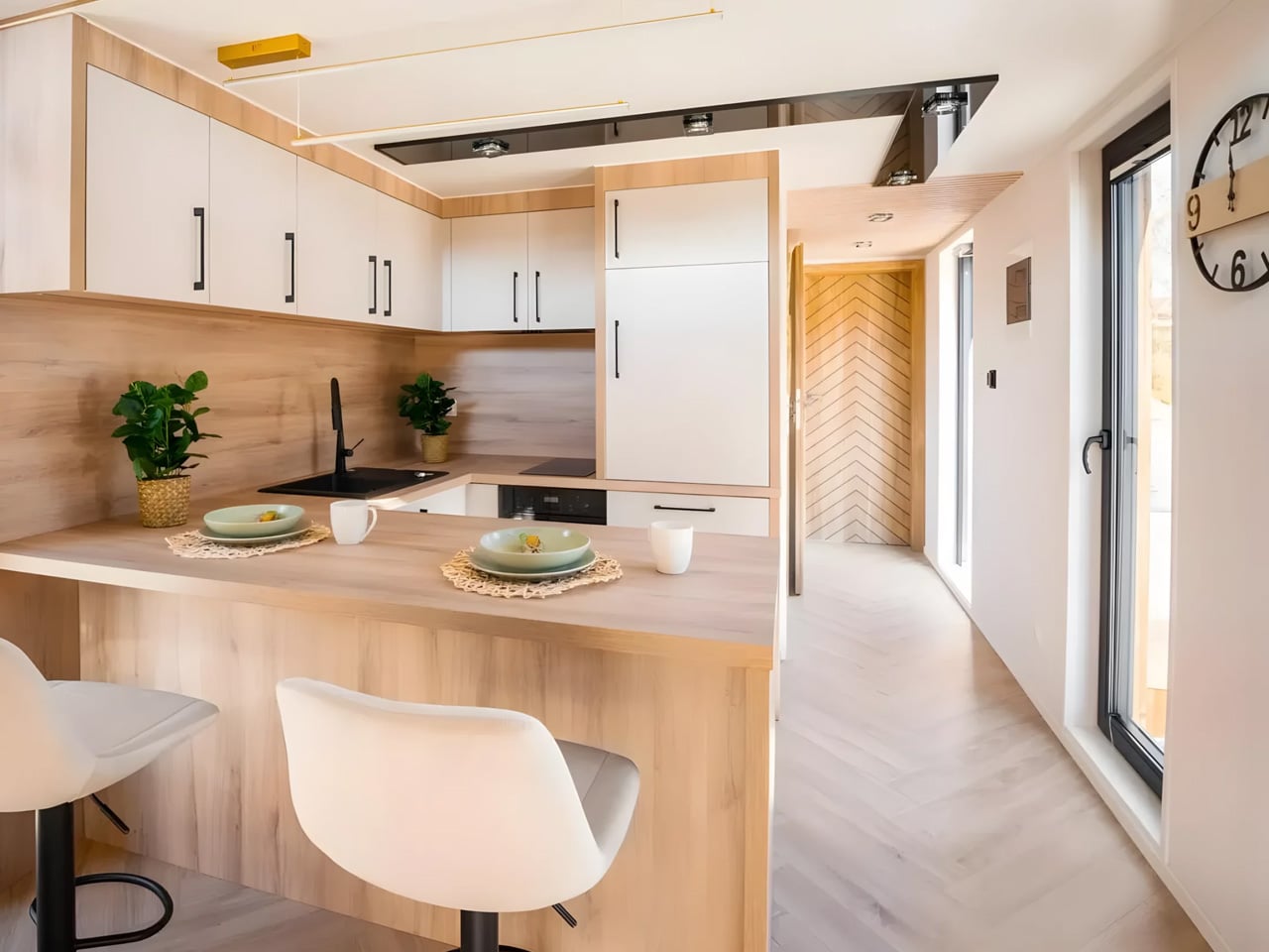 Inside, light does a lot of the work. Generous glazing runs throughout, and multiple skylights flood the space with natural brightness that makes the interior feel larger than its dimensions suggest. The kitchen is a genuine highlight, offering real cabinetry and a breakfast bar for two. This is not a kitchenette tucked into a corner. It is a proper cooking space built for everyday use, and it shows that Craft House understands what people actually need when they downsize.