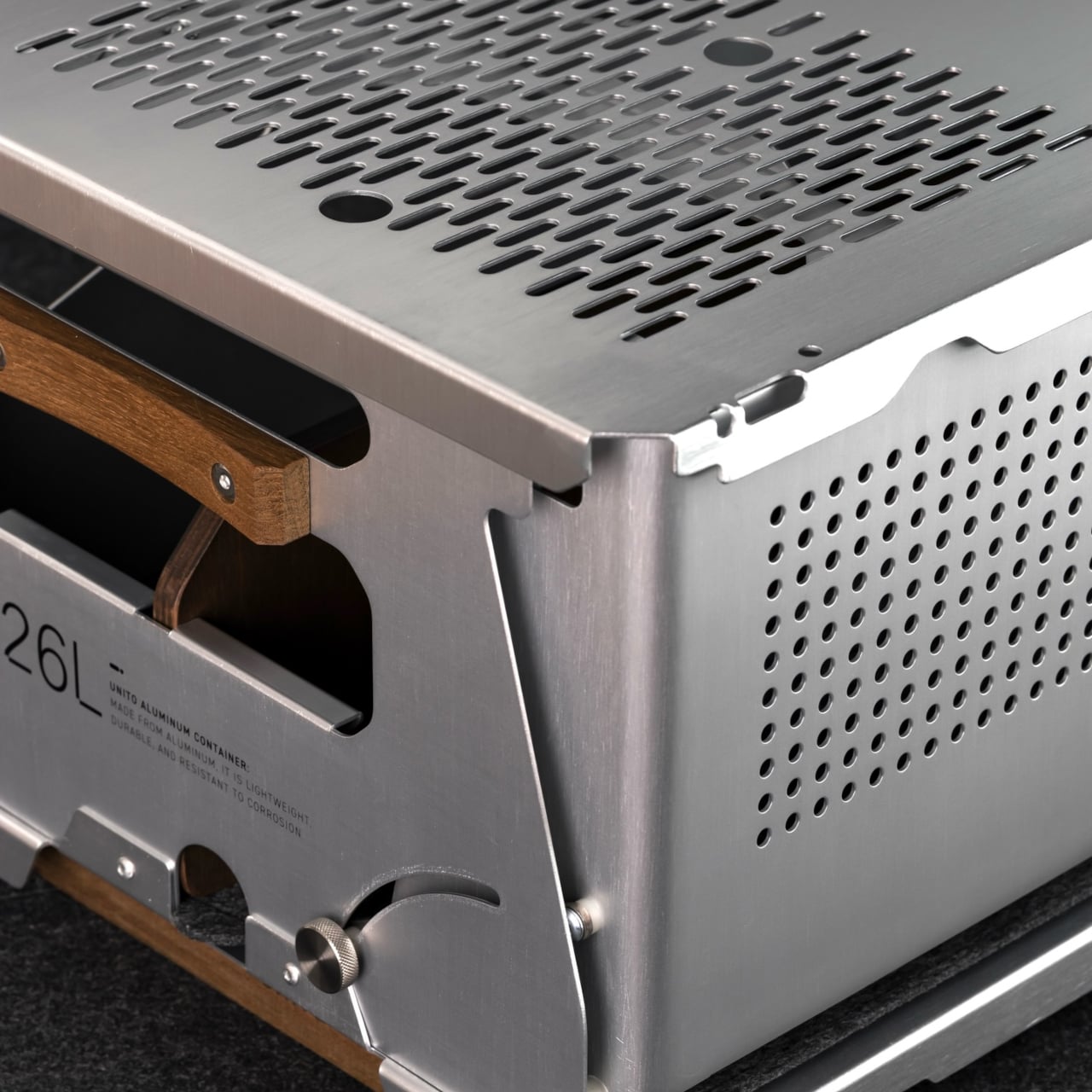 Teak handles sit on either side of the box, giving you a comfortable grip that reads differently against the metallic finish. The flip-out teak extension legs raise the container off the ground into a standing station. Unito supposedly sources the wood from managed plantation forests in Thailand, where the brand is made, addressing concerns about the choice of material.
