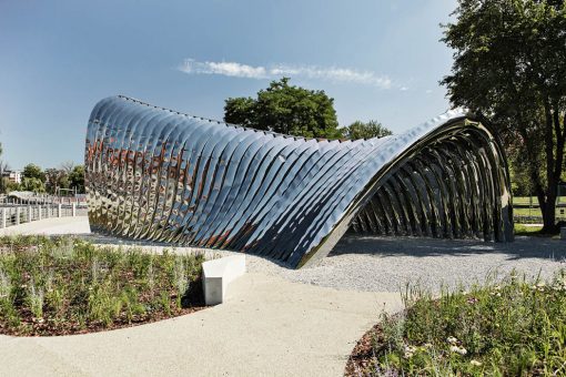 Located on one of the islands in the historic downtown area of Wrocław, this public sculpture by Oskar Zieta reflects the shape of the island…