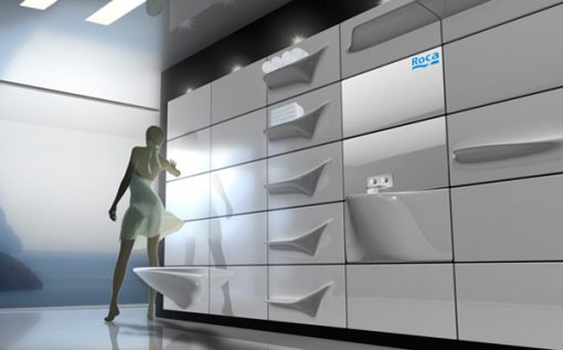 By modulating all the fittings and fixtures of a bathroom on just one wall, the Fluid Wall creates an ambience of asymmetrical and organic surfaces….