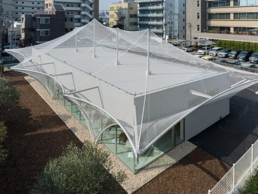 The Cs Somme Cafe in Fukuoka, Japan, features a striking web-like canopy made of steel and mesh and is designed by the architecture studio Kengo…