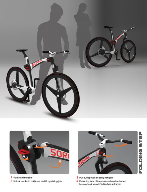 The Sorena folding bike concept uses a clever combination of intuitive locking levers to easily switch between riding and carrying positions. In just four steps…