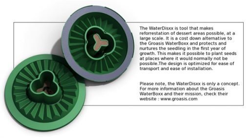 The WaterDisxx makes it possible to plant seeds almost anywhere. It provides the seed with everything it needs to grow, and makes reforrestation of desert…