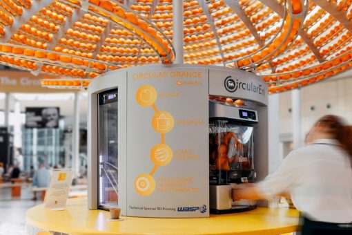 Carlo Ratti’s Orange Juice Machine serves OJ in cups made from 3D printed orange peels
