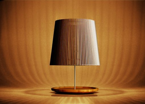 The Molting lamp’s unique arrangement of aluminum and walnut strips that make up its classically shaped shade create a visual eccentricity that appears to change…